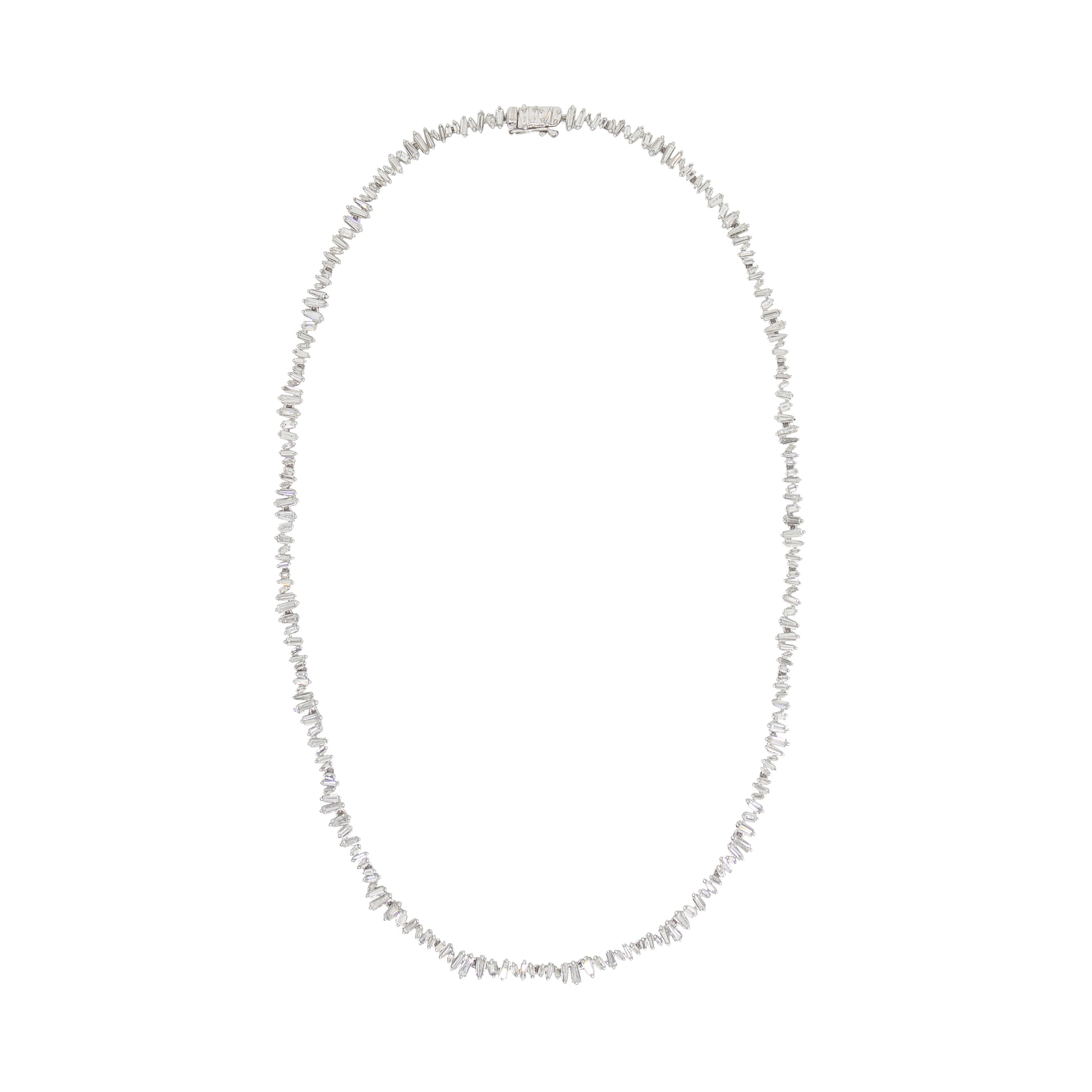 An elegant reimagining of the diamond line, this necklace features a continuous strand of clustered baguette-cut natural diamonds. Artfully arranged to create a rhythmic sparkle — sharper, more architectural than round brilliants, yet still soft enough for everyday wear. This necklace is a celebration of geometry and glamour, for the woman who moves effortlessly between classic elegance and modern edge.