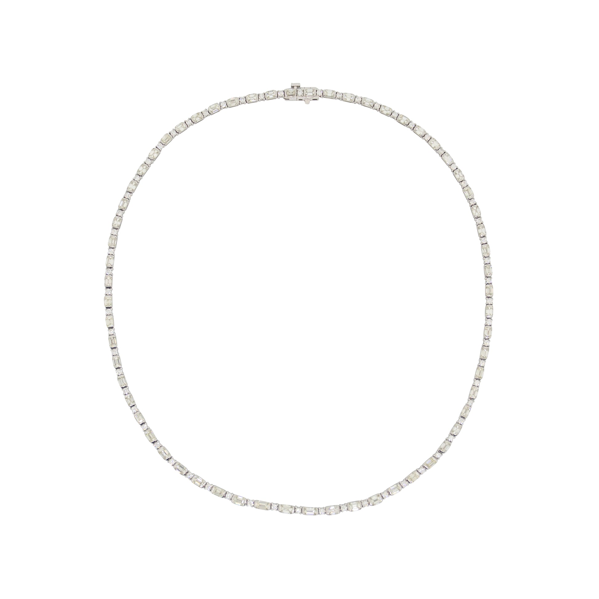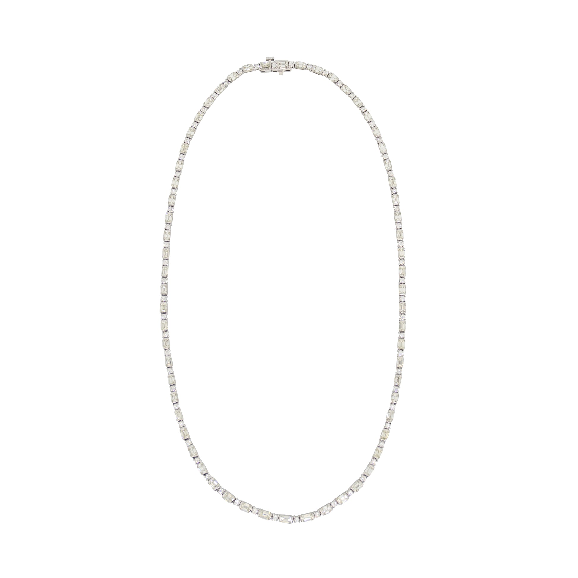 A modern reimagining of the classic diamond line necklace, this piece alternates brilliant round and elegant emerald-cut natural diamonds in a continuous strand of light. The interplay of shapes creates a refined rhythm, offering both timeless sophistication and a fresh, contemporary twist. Set in 14K white gold, the design is perfect for layering or wearing as a standalone statement of understated luxury.